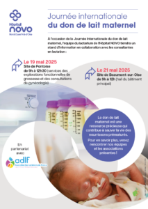 À l’occasion de la Journée Internationale du don de lait maternel, l’équipe du lactarium de l’Hôpital NOVO tiendra un stand d’information, en collaboration avec les consultantes en lactation, sur ses sites de Pontoise et de Beaumont-sur-Oise.