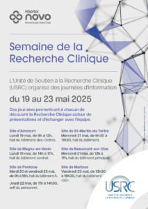 L’Unité de Soutien à la Recherche Clinique (USRC) organise des journées d’information du 19 au 23 mai 2025. Ces journées permettront à chacun de découvrir la Recherche Clinique autour de présentations et d’échanger avec l’équipe. Site d’Aincourt : Lundi 19 mai, de 9h à 12h, hall du bâtiment des Cèdres. Site de Magny-en-Vexin : Lundi […]