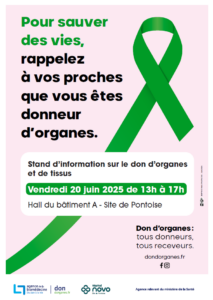 Venez échanger avec l’équipe de la Coordination des prélèvements d’organes et de tissus de l’Hôpital NOVO à l’occasion de la journée du don d’organes et de tissus : Vendredi 20 juin 2025 de 13h à 17h dans le hall du bâtiment A (Site de Pontoise). « Pour sauver des vies, rappelez à vos proches que vous […]