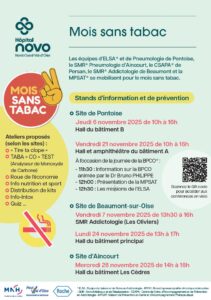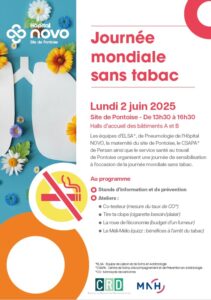 Lundi 2 juin 2025 de 13h30 à 16h30 Halls d’accueil des bâtiments A et B – Site de Pontoise Les équipes d’ELSA*, de Pneumologie de l’Hôpital NOVO, la maternité du site de Pontoise, le CSAPA* de Persan ainsi que le service santé au travail de Pontoise organisent une journée de sensibilisation à l’occasion de la […]