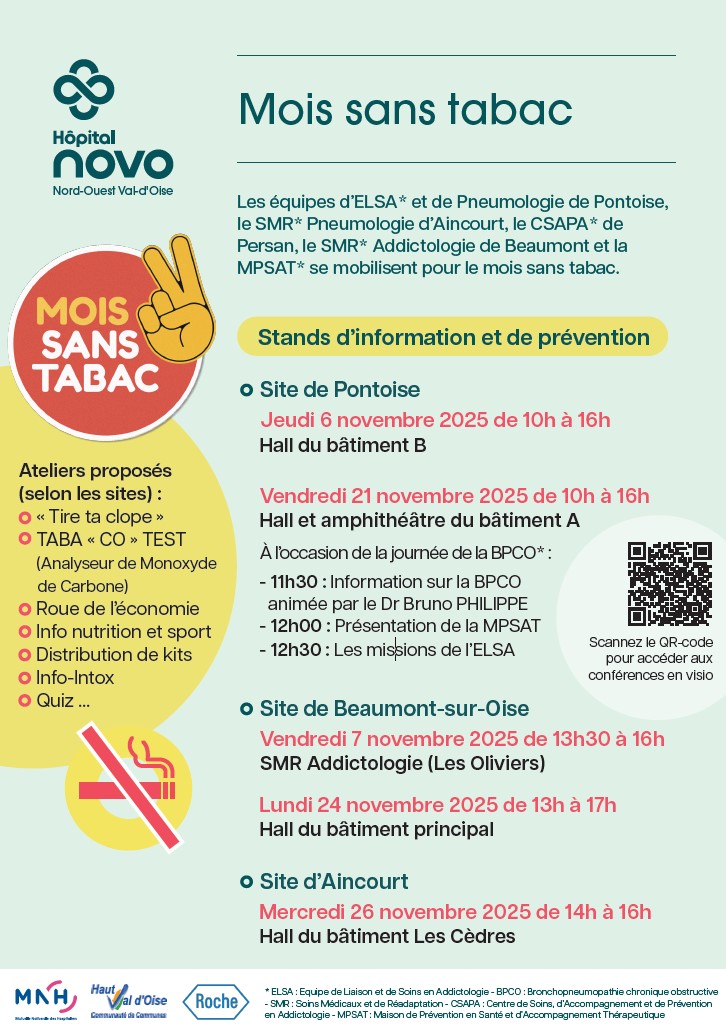 Les équipes d’ELSA* et de Pneumologie de Pontoise, le SMR* Pneumologie d’Aincourt, le CSAPA* de Persan, le SMR* Addictologie de Beaumont et la MPSAT* proposeront tout au long du mois, des stands d’information et de prévention et des ateliers.