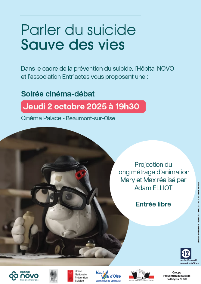 L’Hôpital NOVO et l’association Entr’actes organisent une nouvelle soirée cinéma-débats sur la prévention du suicide le jeudi 2 octobre 2025 à 19h30 au Cinéma Palace (6 avenue Anatole-France 95260 Beaumont-sur-Oise).